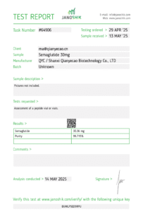 Each lot is sourced through our verified global supply chain with emphasis on traceability and quality control. We work diligently to obtain and maintain third-party analytical reports (HPLC/LC-MS) and Certificates of Analysis for each batch, as part of our ongoing quality process. These documents are reviewed internally and displayed as they become available. Independent third-party testing is also performed on select lots to confirm identity, purity, and alignment with our internal specifications.